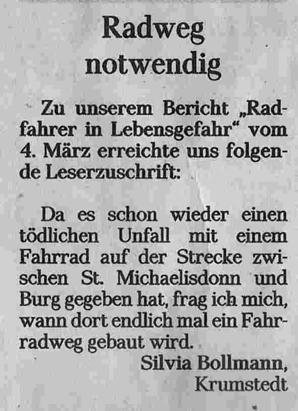 In neun Jahren hat es hier 17 mal gekracht. Die Gemeinden hatten immer wieder Vorstöße unternommen, um die Situation zu entschärfen. So stark können die Vorstöße nicht gewesen sein. Ohne das Land geht es nicht, ist eine uralte Ausrede. Jedes Jahr stirbt ein Radfahrer oder Radfahrerin im Kreisgebiet.
